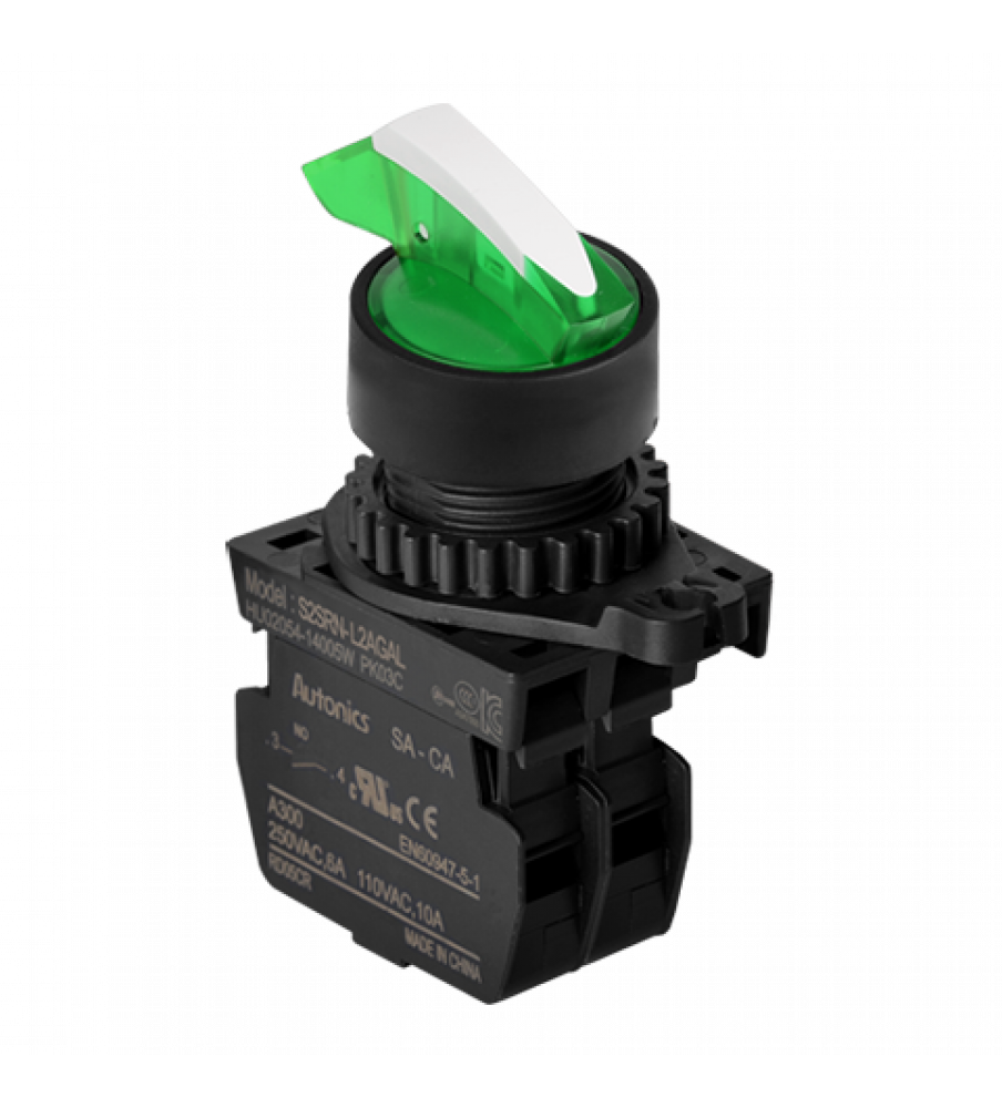 Shark Short Lever Seletor Switches, Non-Flush, Illuminated, ?22/25, 2 Positions maintained Center 0? Right 90?,Green, 1 Normal Open 1 Normal Close ,Multi Stack, LED 110-220VAC 50/60Hz
