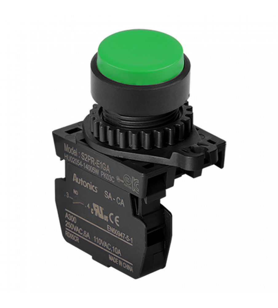 Non-Illuminated Push Button (Non-Flush), ?22/25, Raised Button, Green, Normal Open, Modular Type,110VAC/10A,220VAC/5A