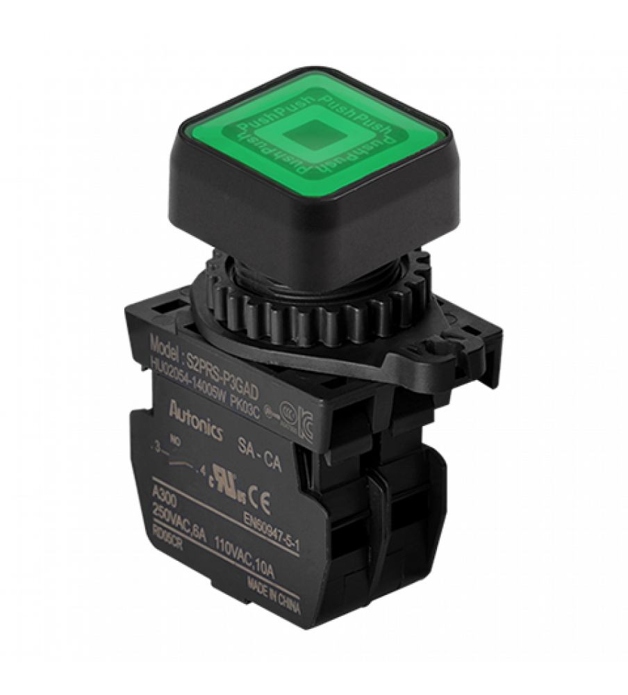 Square Type Push Button (Non-Flush/Illuminated), ?22/25, Green, Normal Open, Modular Type, LED 100-220VAC