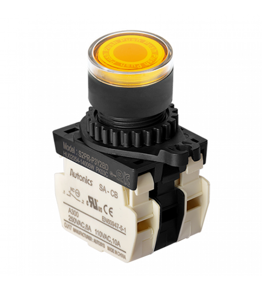 Illuminated Push Button (Non-Flush), ?22/25, Yellow, 2 Normal Close, LED 100-220VAC