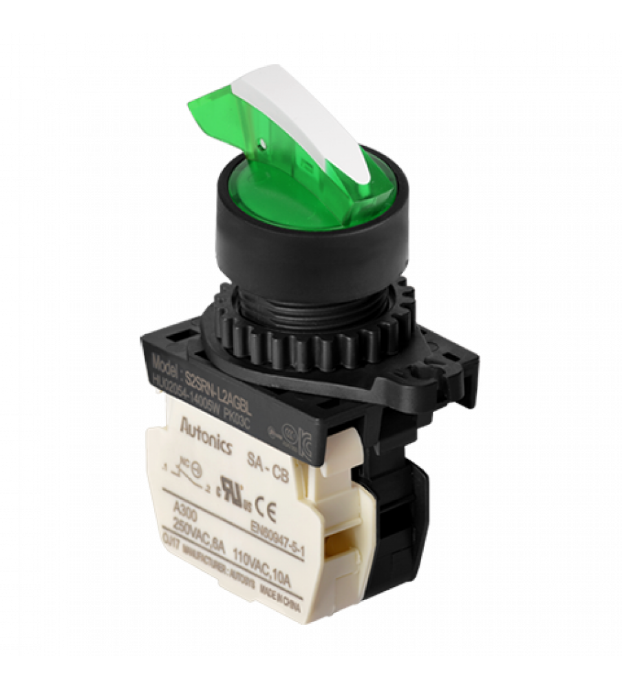Shark Short Lever Selector Switches, Non-Flush, Illuminated, ?22/25, 2 Positions Spring Return Center 0? Right 60?,Green, 1 Normal Open, Modular Type, LED 110-220VAC 50/60Hz
