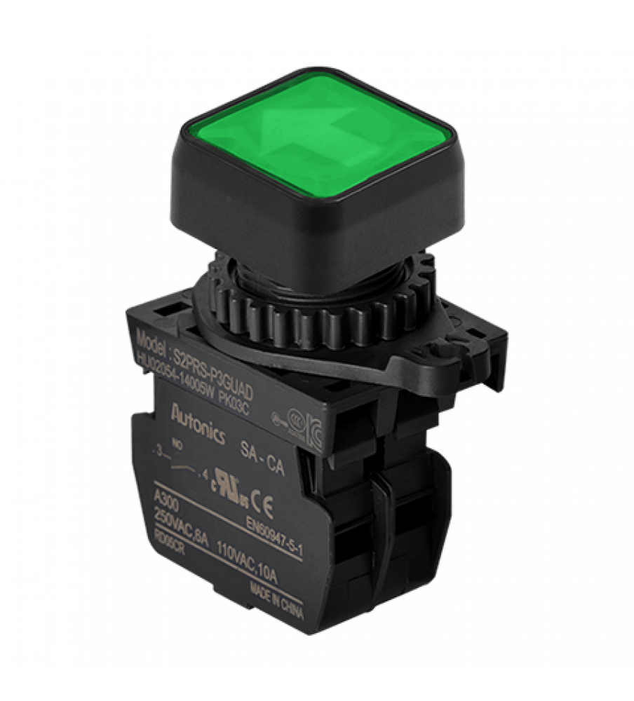 Square Type Push Button (Non-Flush/Illuminated), ?22/25, Green, Normal Open, Modular Type, LED 100-220VAC, Arrow Mark Up/Down