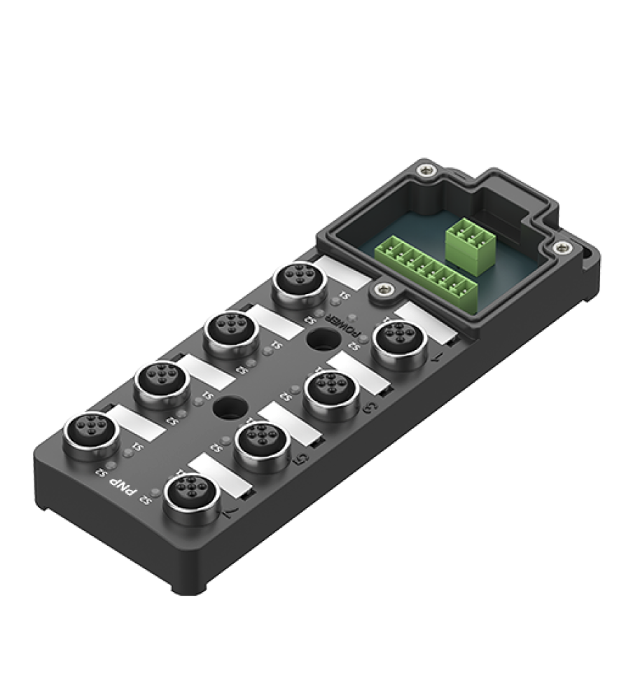 Tags: Connection Box, Pluggable Screw Termanal Type, 8 Port, M12, 5PIN, DC 3 Wire, PNP, Black, Hood cover excluded