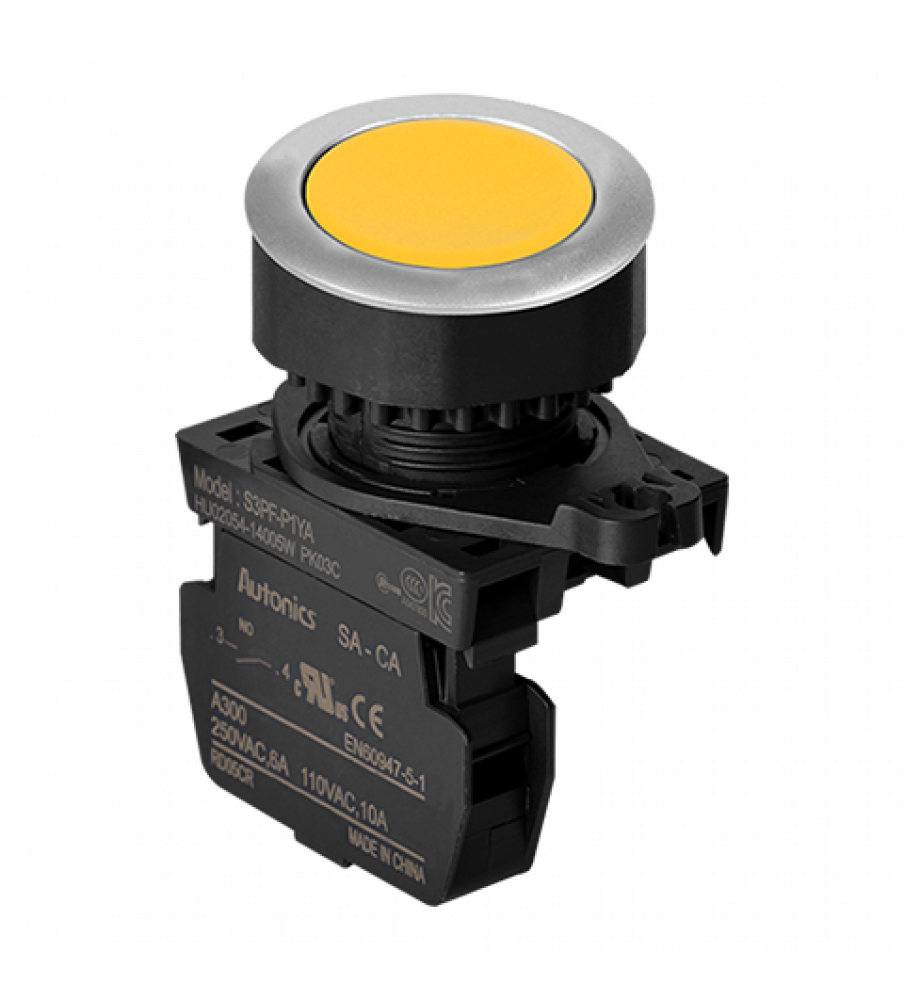 Non-Illuminated Push Button (Flush), ?30, Yellow, Normal Open, 110VAC/10A,220VAC/5A