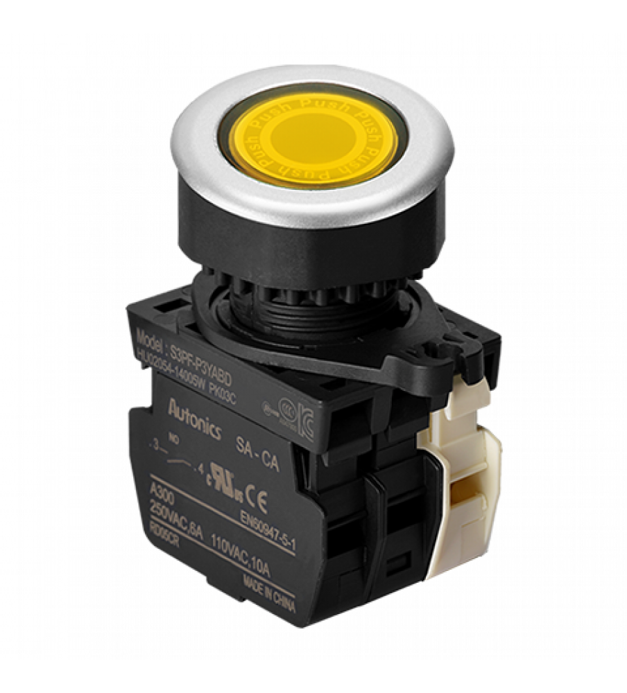 Illuminated Push Button (Flush), ?30, Yellow, 1 Normal Open, 1 Normal Close, LED 100-220VAC