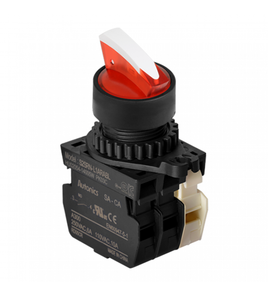 Shark Short Lever Selector Switches, Non-Flush, Illuminated, ?22/25, 3 Positions maintained Left 90? Right 90?,Green, 1 Normal Open 1 Normal Close, Multi Stack, LED 110-220VAC 50/60Hz