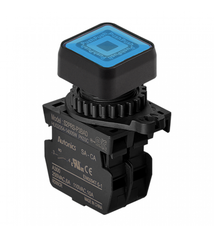 SquareType Push Button (Non-Flush,Illuminated), ?22/25, Blue, Normal Open,Single Stack, LED 100-220VAC