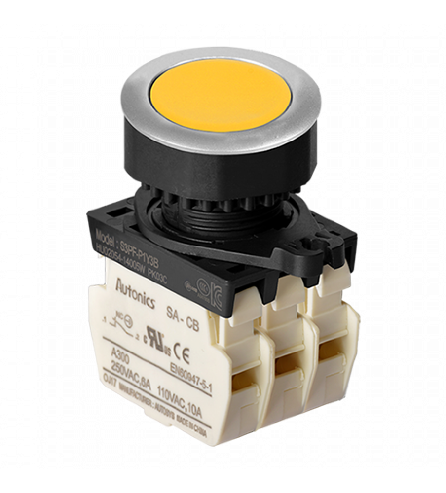 Non-Illuminated Push Button (Flush), ?30, Yellow, 3 Normal Close, 110VAC/10A,220VAC/5A