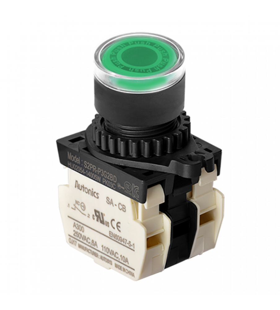 Illuminated Push Button (Non-Flush), ?22/25, Green, 2 Normal Close, LED 100-220VAC