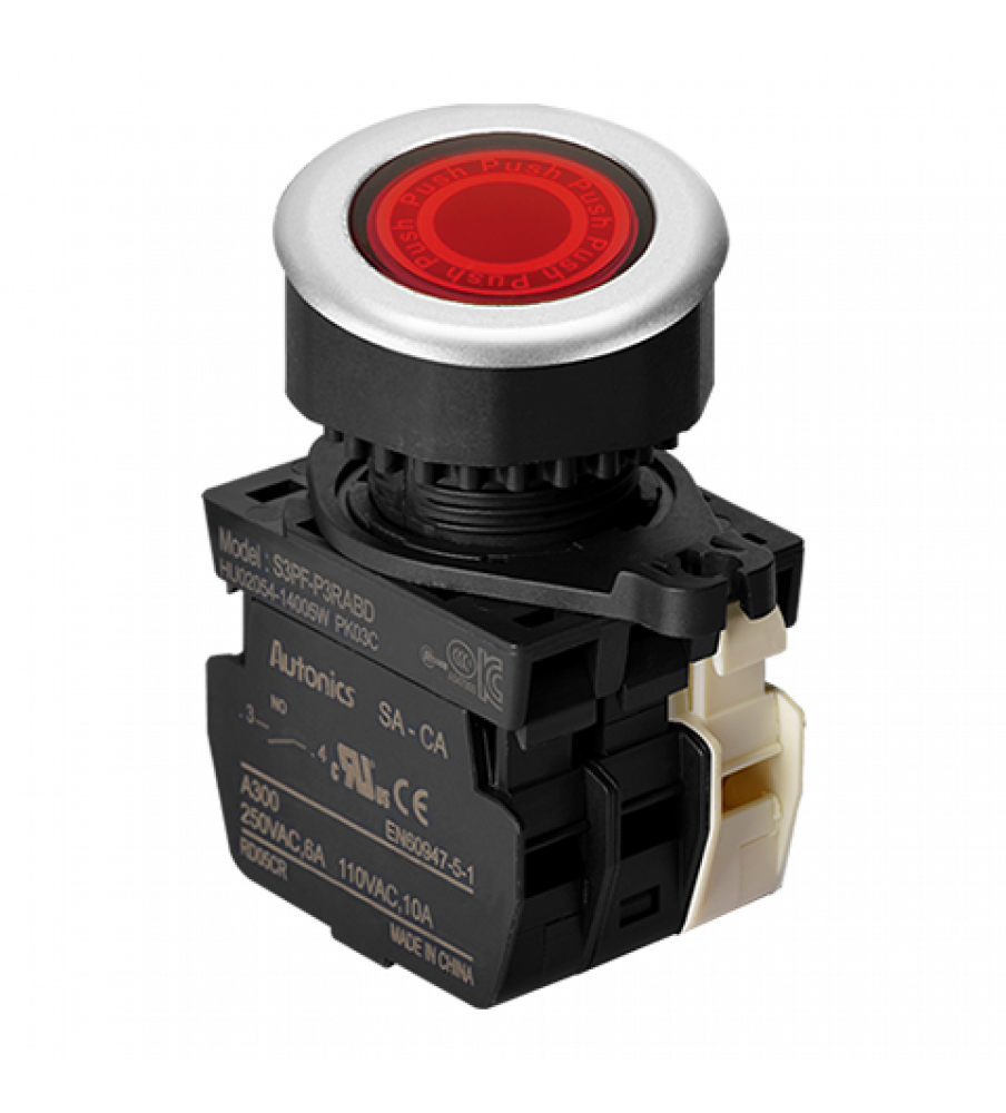 Illuminated Push Button (Flush), ?30, Red, 1 Normal Open, 1 Normal Close, LED 12-30VDC/AC